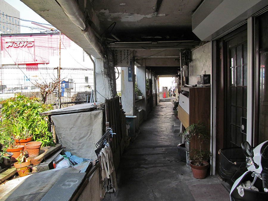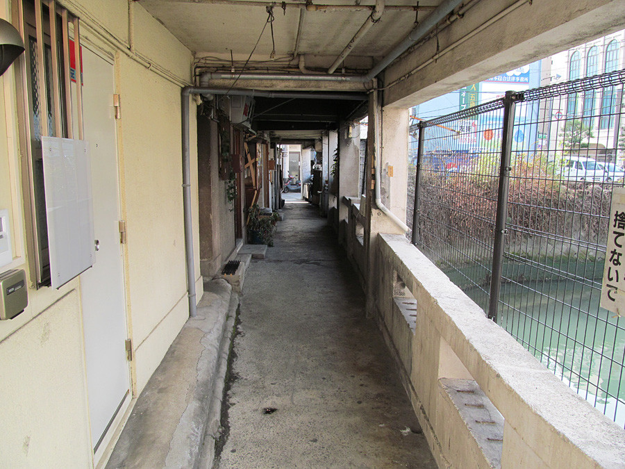 逆アングルです。植木鉢などが置いてある景観は、軍艦島に残されている通路の広いアパートの造りを彷彿とさせますね。