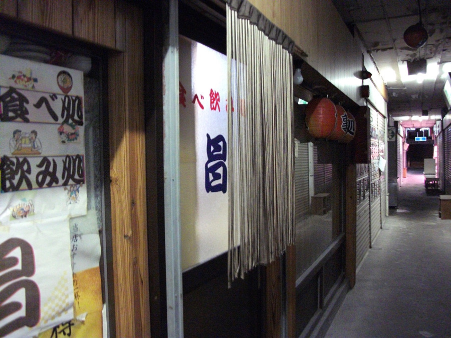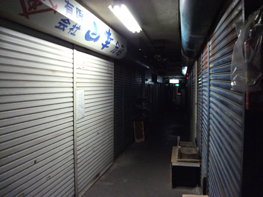 撮影時は週末の午後7時半くらいでしたが、灯があったのは、手前に見える市場でただ1軒の居酒屋さんと、奥に見える精肉やさんのみでした。居酒屋さんも2月には閉められるだろうとのこと。