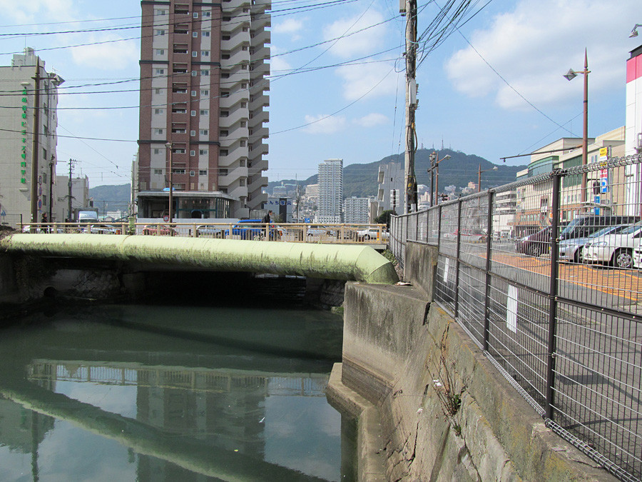 長崎市大黒町。駅前の大通りから一本入った場所にある新橋。橋の上には店舗や住居の入る建物があり、一見橋とは思えない景観となっていますが、これが市内最古のRC(鉄筋コンクリート)造の橋梁である新橋です。