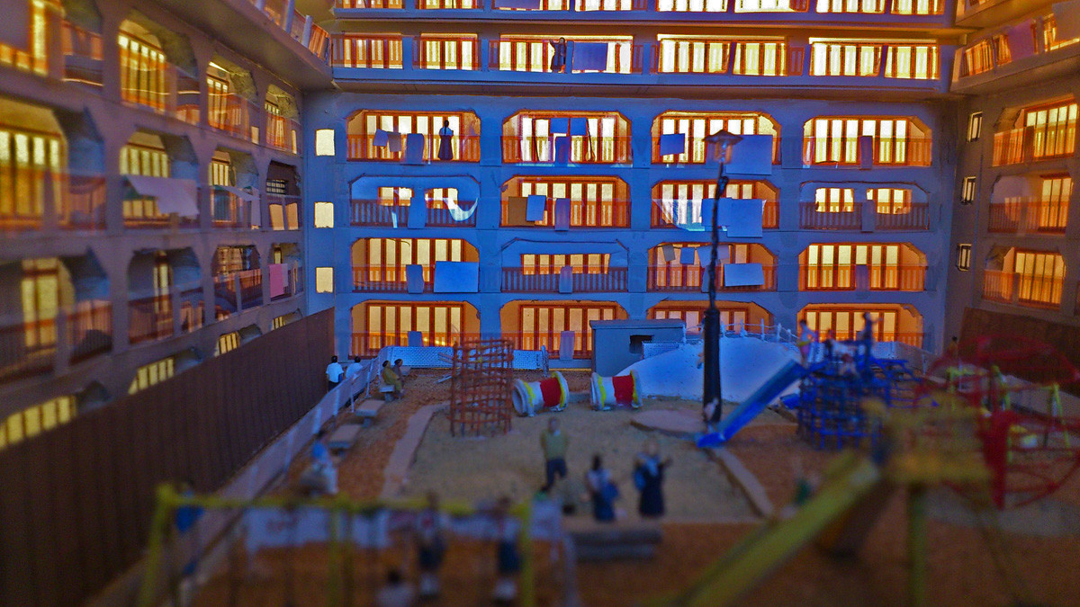 コの字型の65号棟に囲まれた児童公園。夕暮れともなると、このように家々の灯に囲まれたことでしょう。