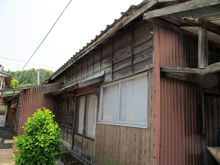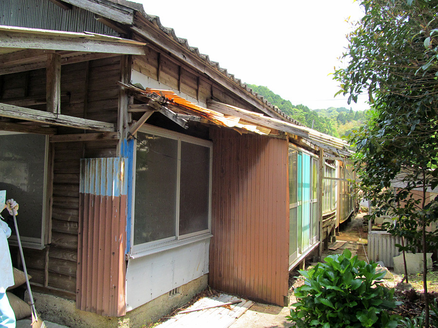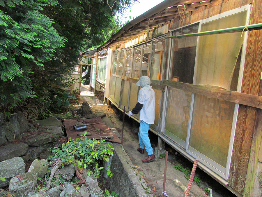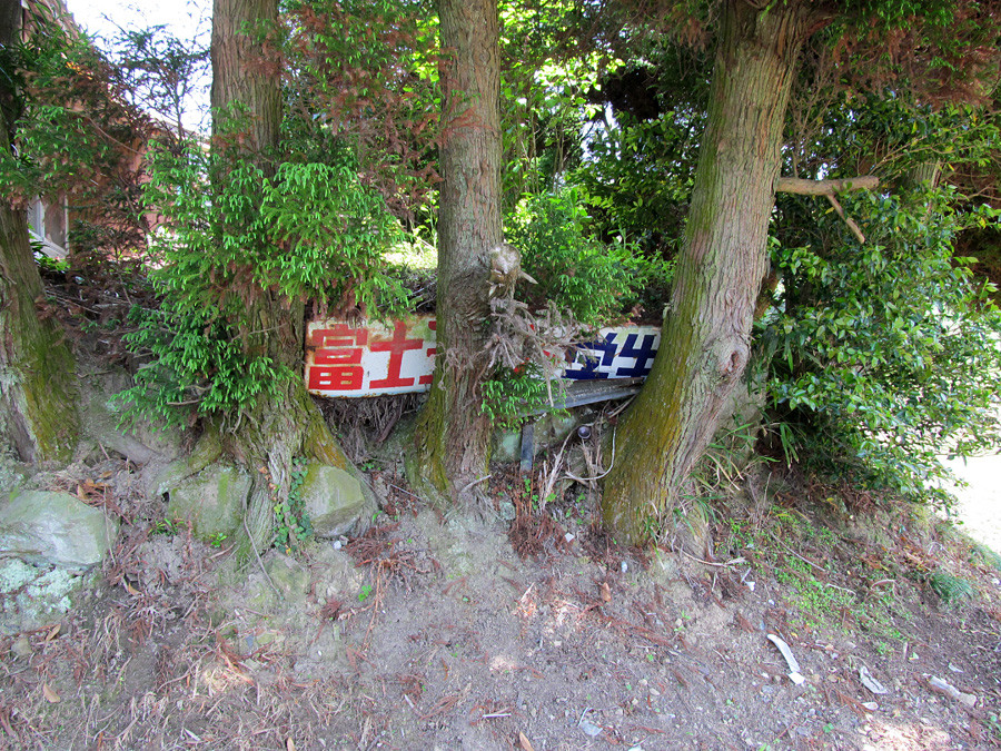 この住宅の建っている石垣で見つけた物。学生服のほうろう看板ですね。これはかつてこの地に多くの家族が暮らしていた、という何よりの証拠です。(幹線道路でもない畑の中に学生服の看板はまず出さないでしょうから)