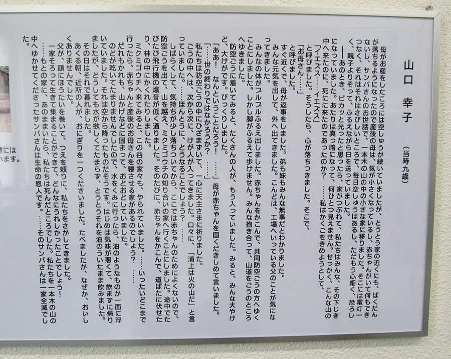 永井 隆博士の娘、茅乃さんの写真もありました。すぐ後に移っている山口 幸子さんの書いた被爆体験作文の中の「のどが乾いてたまりませんでした・・・」という一文は、平和公園内の泉の前の碑に刻まれています。