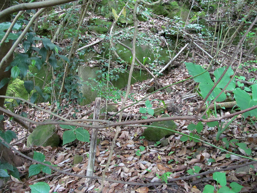 しかし、こちらの方は残念ながら土砂によりほぼ埋まってしまっていたようでした。近くにお住まいの方に聞いて、「坑口があった」という場所に行ってみましたが、樹木の生い茂る崖の斜面であり、わずかにコンクリートの壁の一部を確認するにとどまりました。
