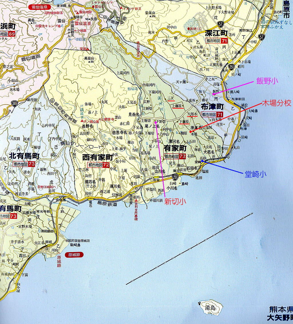 赤いアンダーラインをした「三又」「藤原」「六郎木」といった地区が、木場分校の校区なのですが、海岸部にある堂崎小本校に行くよりは、西側の新切(しんきり)小学校や布津(ふつ)町の飯野小学校のほうが距離的には近い気がします。