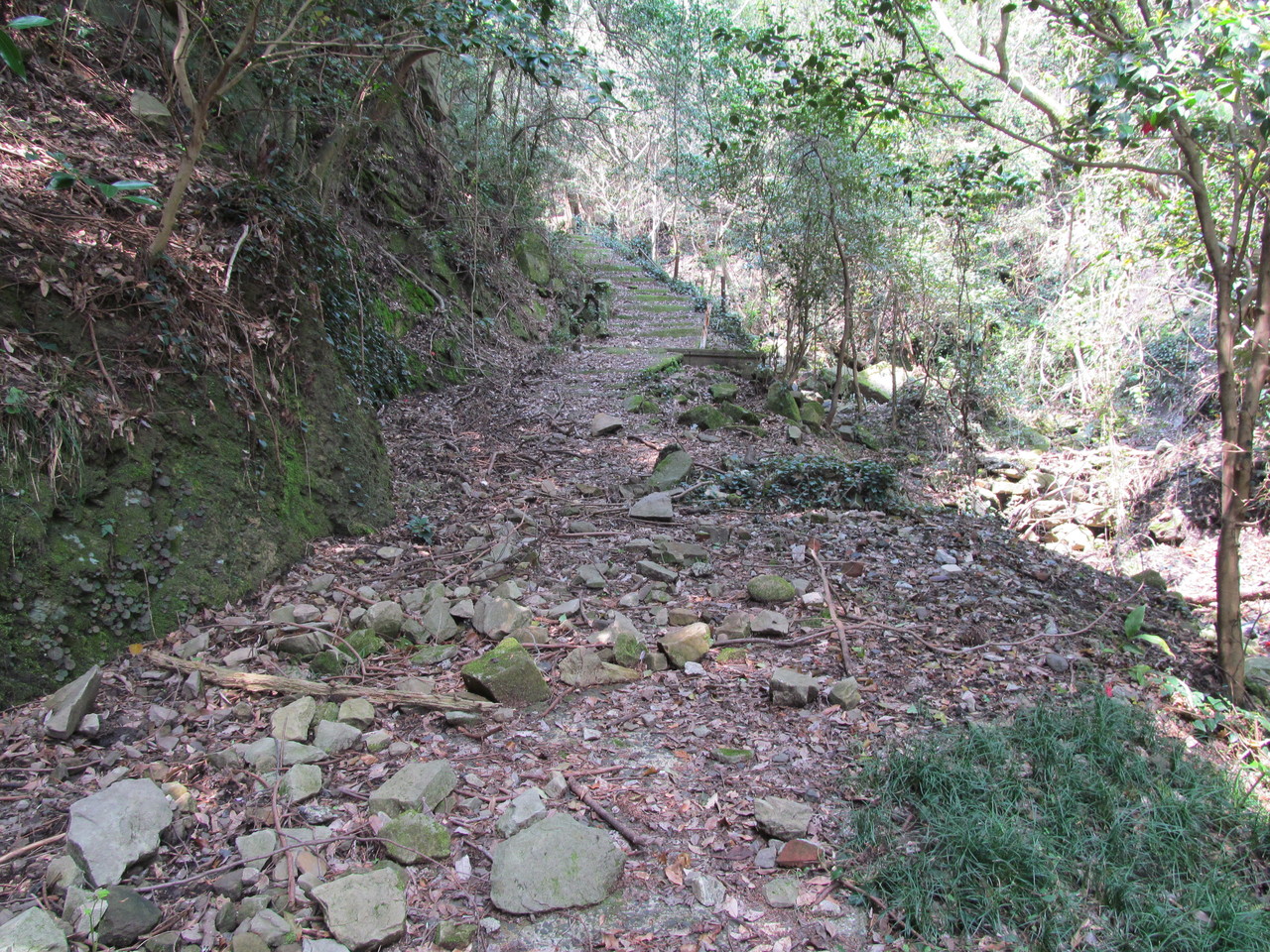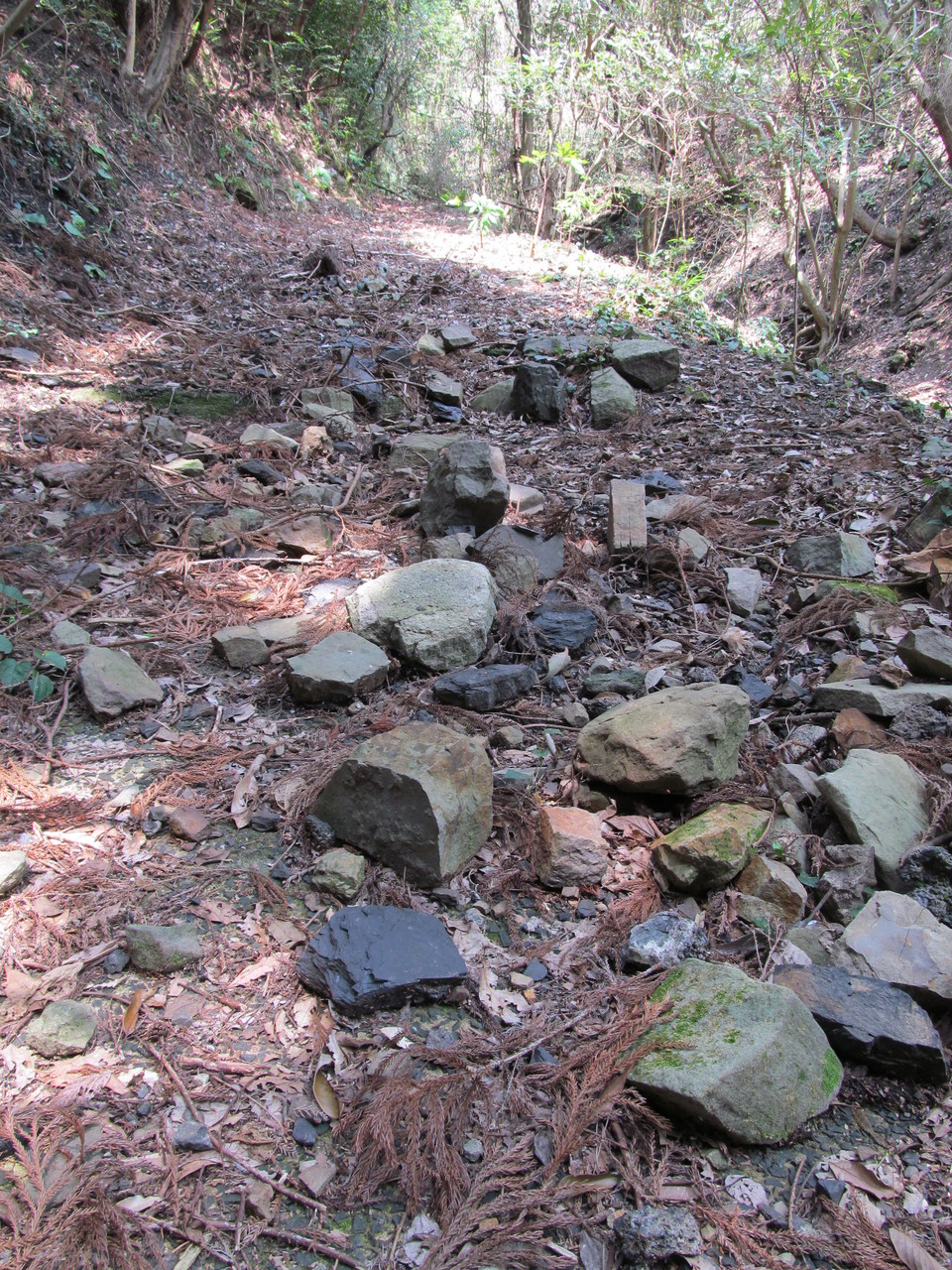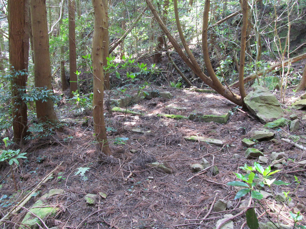 林の中にも所々、建物があったと思しき場所に石積みが見えます。