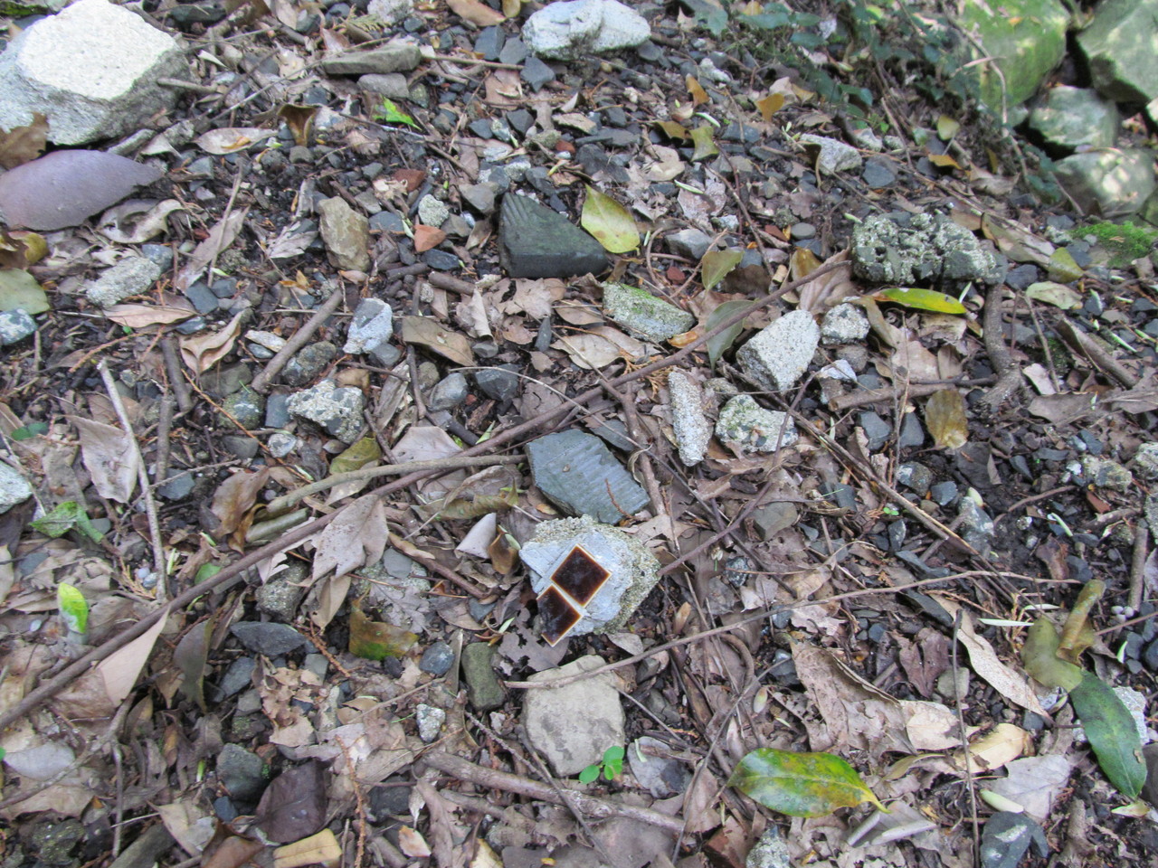 発見して特に趣深いのは、このような小さなタイル片です。お風呂場、或いは炊事場、小さな手洗い場のものかもしれません。しかしこのようなひと気も無い深い山の中に生活を思い起こさせるようなものがあると、ほのぼのとした気持ちにさせらるのです。