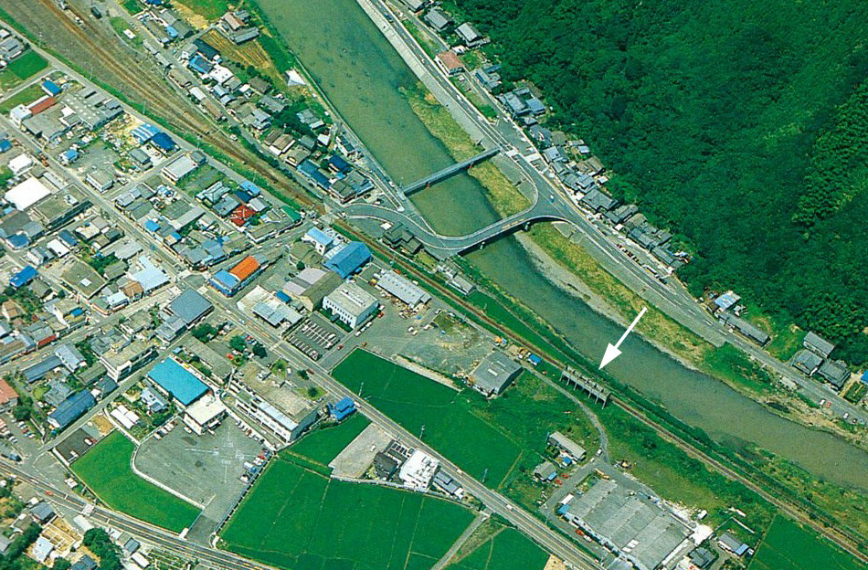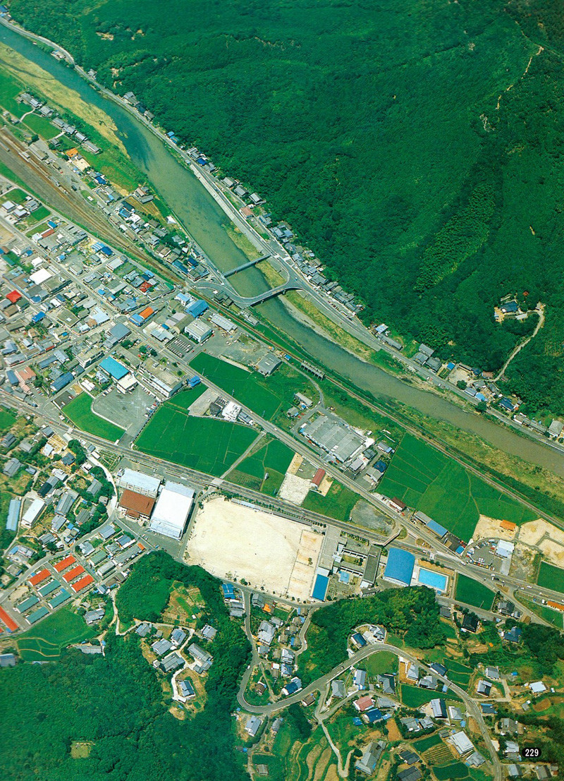 これは昭和57年頃、今の松浦鉄道佐々駅北側付近を写した航空写真です。写真中央付近に積み込み用の原炭ポケットが見えています。