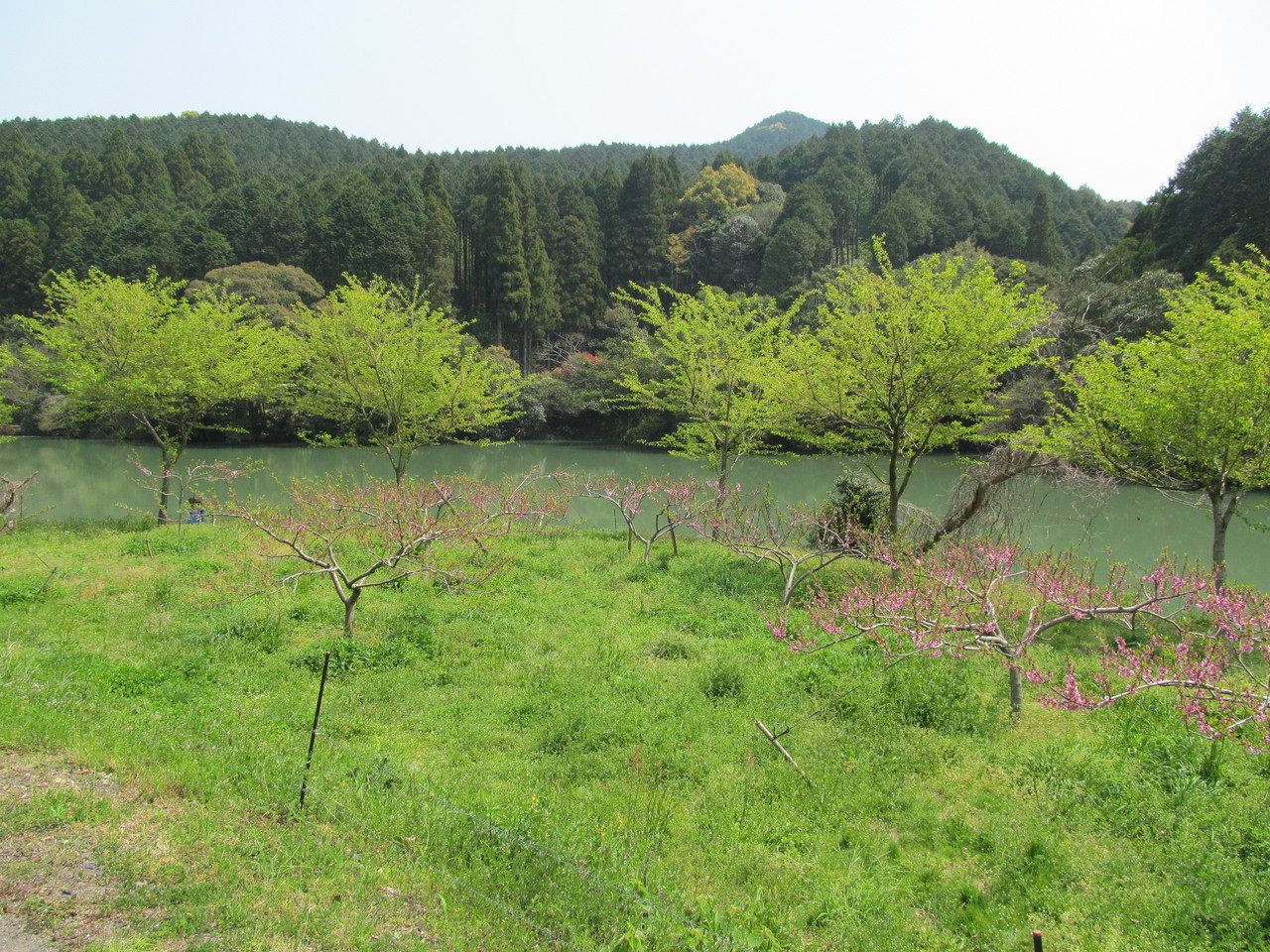 山を下りきった場所から小道を少し進むと、事務所があったと思われる敷地があり、その前には池があります。その周りには桜や桃などの花木が植えられています。どの時代に植えられたものかは判りませんが、事務所跡敷地にある椰子の木などはおそらく炭坑時代のものでしょう。